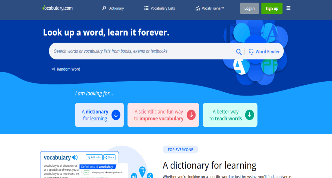 3. يتحوّل الموقعمن عملية تعلم المفردات إلى تجربة مشوقة من خلال مجموعة متنوعة من الألعاب والاختبارات التفاعلية تكون مناسبة لجميع الأعمار لكي يحافظ علي شغف التعلم وزيادة الدافع ويجعل التعلم أقل مللًا. تتمثل التمارين في اختيار من متعدد، ملء الفراغ، مطابقة الكلمات بالتعريفات ويكون ذلك ضروري في اختبار فهمك للكلمات بطرق مختلفة.