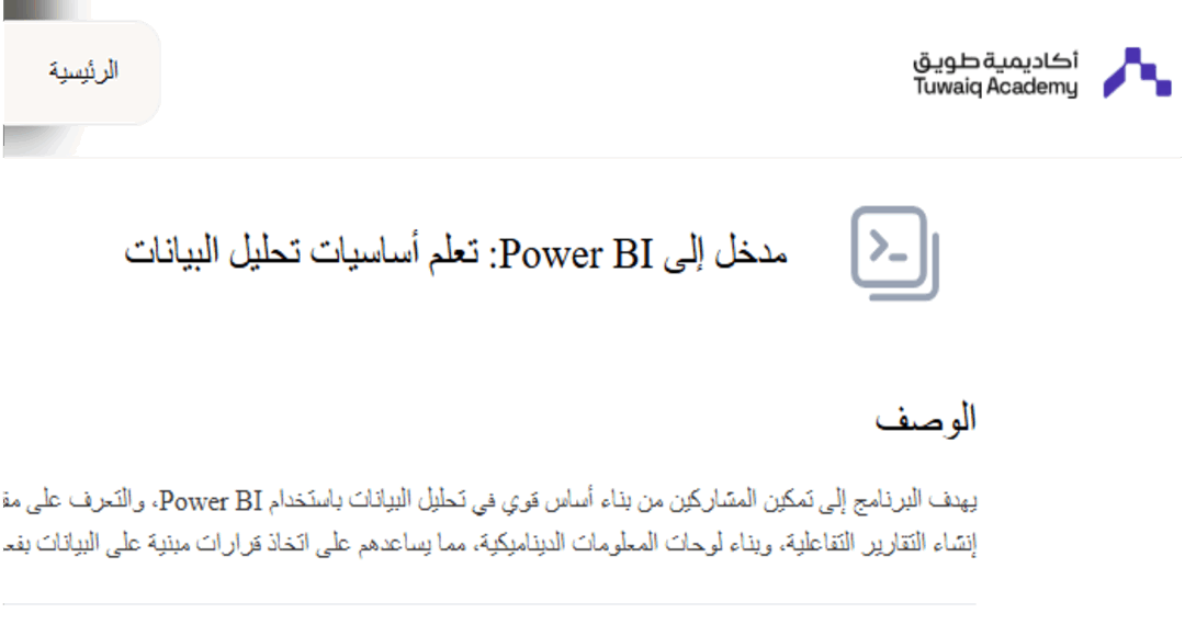 أكاديمية طويق تعد من أبرز الجهات التعليمية في المملكة العربية السعودية التي تقدم برامج ومعسكرات نوعية في مجالات التقنية. ومن الدورات المهمة التي تطرحها، يأتي برنامج مدخل إلى Power BI، الموجه للمبتدئين الراغبين في دخول عالم تحليل البيانات وتعلم أساسيات هذه الأداة المتقدمة.